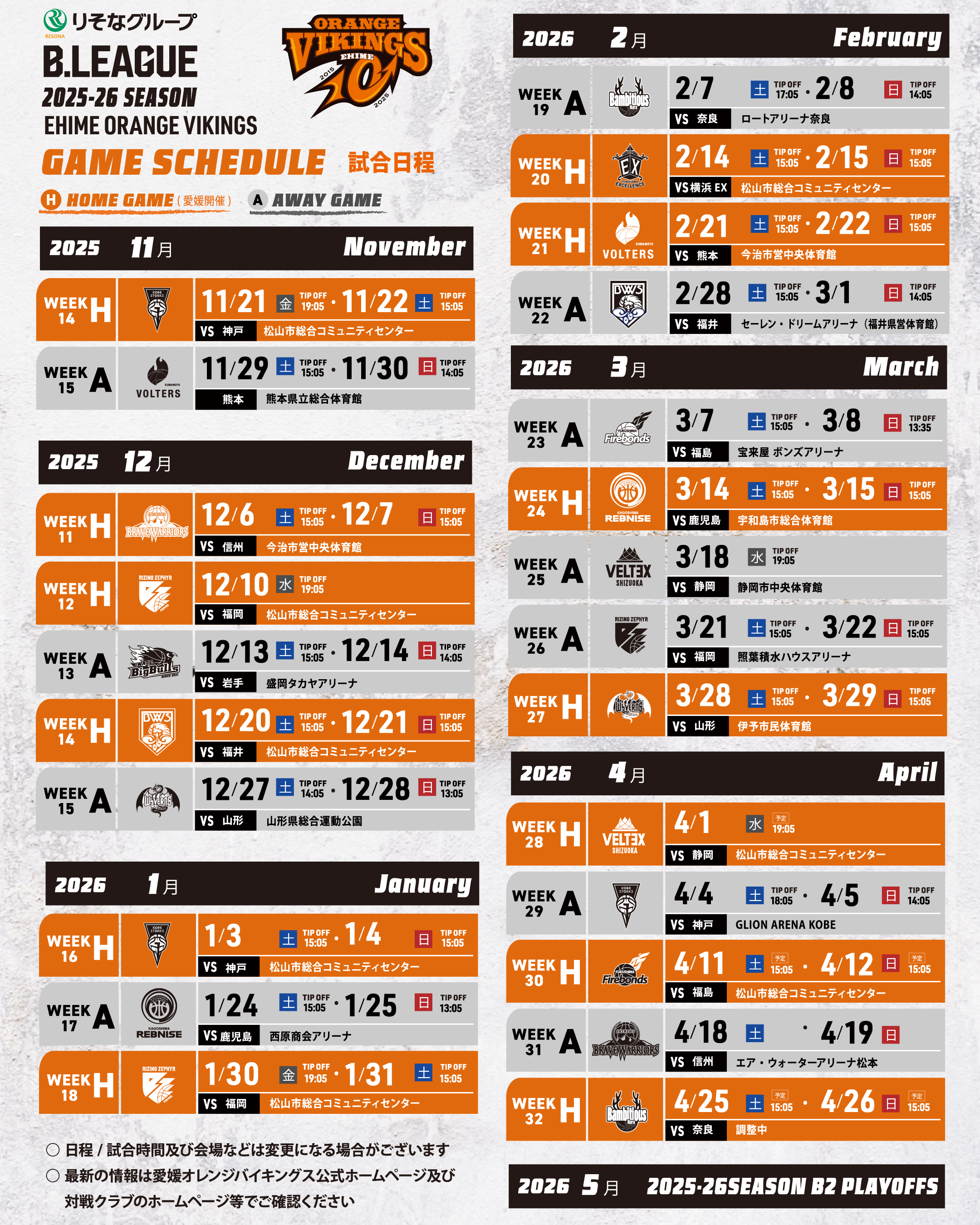 最新の情報は、愛媛オレンジバイキングス公式ホームページおよび対戦クラブのホームページ等でご確認ください。