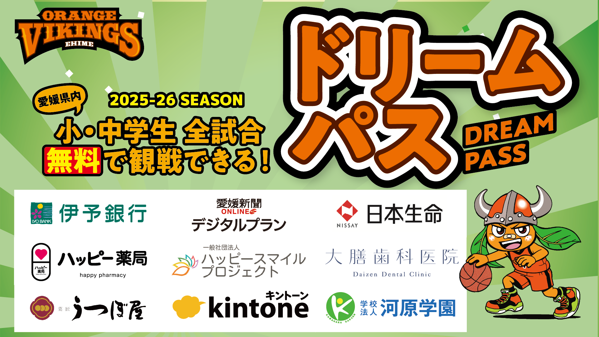 伊予銀行、愛媛新聞社、日本生命、ハッピー薬局、ハッピースマイルプロジェクト(大谷歯科矯正歯科)、大膳歯科医院、うつぼ屋、キントーン(サイボウズ)、河原学園共催のもと、愛媛県内の小中学生のお子さまを対象に、愛媛オレンジバイキングスのホームゲーム(レギュラーシーズン30試合)を1階ブロックE席または2階スタンド自由席で無料観戦できます。(申込必須)